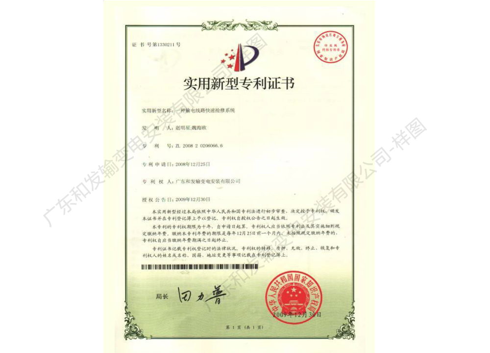 ERS電力緊急搶修系統(tǒng)專利證書